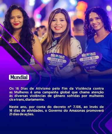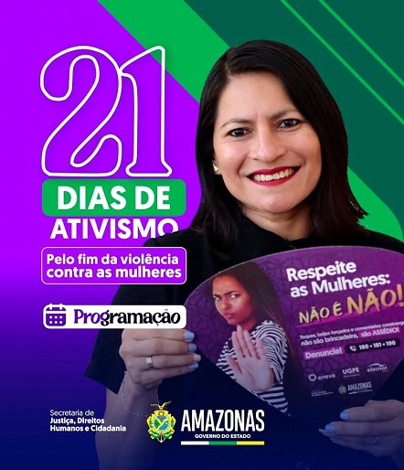 Manaus e o estado do Amazonas seguem mobilizados na campanha “21 Dias de Ativismo pelo Fim da Violência Contra as Mulheres”, promovida pela Secretaria de Justiça, Direitos Humanos e Cidadania do Amazonas (SEJUSC).