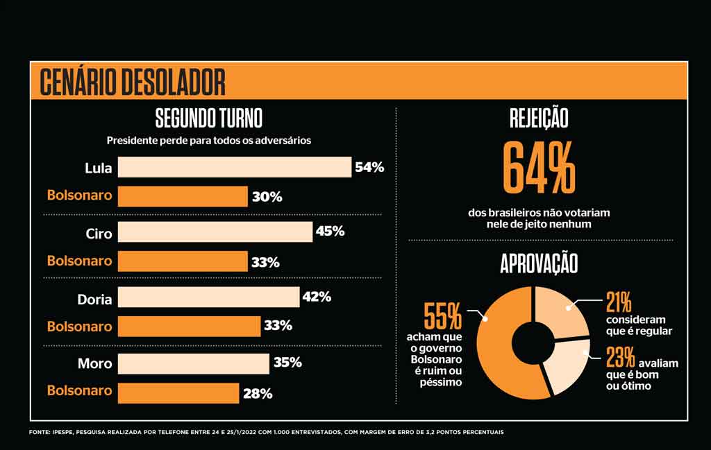 Sua situação cada vez mais grave foi confirmada por pesquisa Ipespe que mostrou um cenário catastrófico nas eleições de outubro. Ele conseguiria apenas 24% dos votos e perderia para Lula (44%). No segundo turno, não conseguiria vencer nenhum dos principais concorrentes (Ciro Gomes, João Doria e Sergio Moro, além do próprio Lula). E sua rejeição é espantosa. Nada menos que 64% dos brasileiros afirmaram que não votariam nele de jeito nenhum. São dados demolidores. “Está cada vez mais na cara que as pesquisas são fraudadas”, martelou Bolsonaro novamente aos seus apoiadores, em estado de negação.