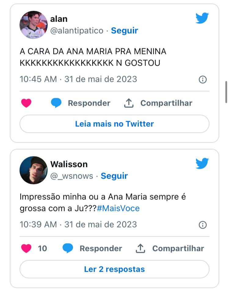 As interações entre Ana Maria Braga e a jornalista Juliane Massaoka, carinhosamente chamada de Juju, durante o Mais Você geraram muitos comentários de telespectadores nas redes sociais. Alguns internautas acharam que Ana Maria estava sendo grosseira, dando "cortadas" em Juju (veja abaixo algumas das reações).
