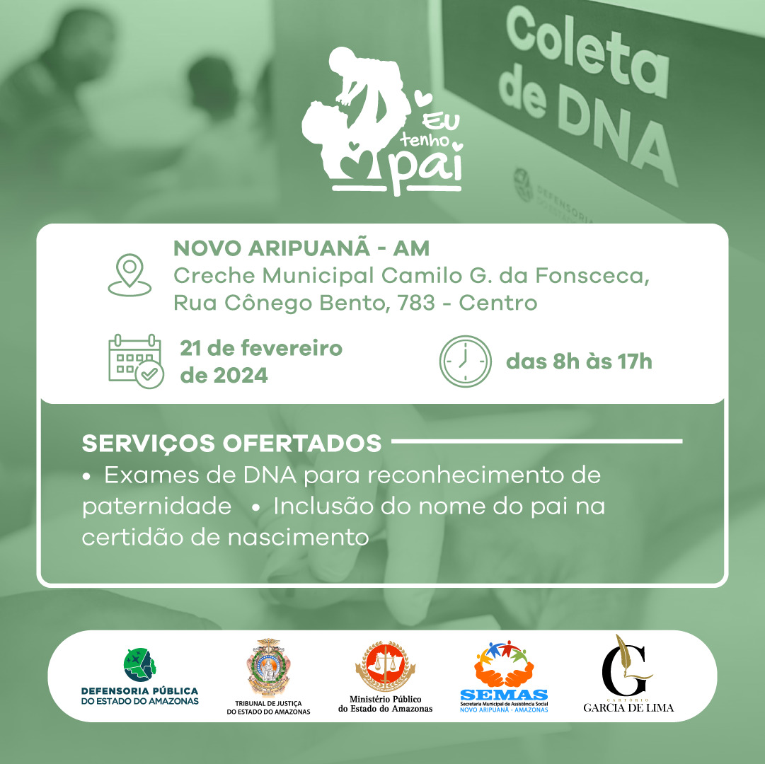 Neste caso, objetivo é não só promover o reconhecimento paterno-filial, como também facilitar a inclusão do nome do pai na certidão de nascimento do filho.A ação é realizada em conjunto com o Tribunal de Justiça do Estado do Amazonas (TJAM), Ministério Público do Estado do Amazonas (MPAM), Cartório Extrajudicial e a Prefeitura de Novo Aripuanã.
