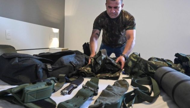 Saulo coloca sobre a cama uma roupa camuflada, um par de botas, cintos para transportar armas e uma faca embainhada. "São os materiais essenciais", diz este ex-agente da Polícia Militar de São Paulo, que deu baixa da corporação para se unir à guerra na Ucrânia.