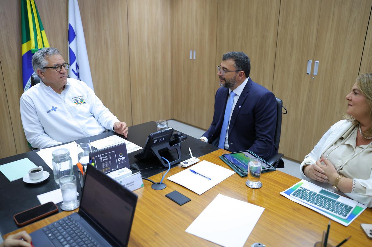 O governador Wilson Lima reuniu-se, na terça-feira, 29/04, em Brasília, com o ministro da Saúde, Alexandre Padilha, para apresentar os avanços do Governo do Amazonas em ações de fortalecimento da assistência e solicitar apoio do Governo Federal para ampliar medidas na área da Saúde, entre elas o Barco Hospital São João XXIII, antecipação da vacinação contra a gripe e ferramentas para descentralizar os serviços no interior.