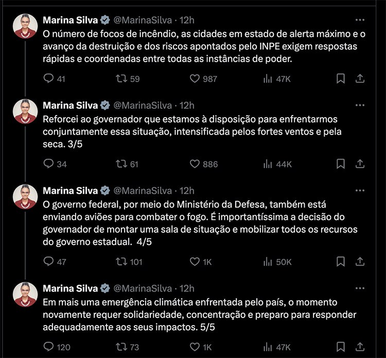 "Reforcei ao governador que estamos à disposição para enfrentarmos conjuntamente essa situação, intensificada pelos fortes ventos e pela seca", publicou Marina na rede X. "O apoio inicialmente mobilizado inclui: - 01 Aeronave KC-390, da Força Aérea; - 03 Aeronaves, do Comando de Aviação do Exército Brasileiro para combate aos focos de incêndios", informou Waldez Góes.