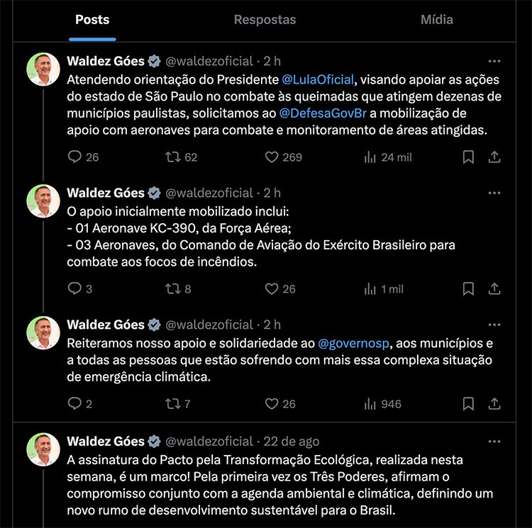 A ministra do Meio Ambiente e Mudança do Clima, Marina Silva, telefeonou na noite deste sábado ao governoador de São Paulo, Tarcísio de Freitas (Republicanos). Marina se solidarizou com a população do estado, que enfrenta ocorrência recorde de incêndios em mais de 30 municípios do interior. E ofereceu ajuda para reforçar o combate às chamas. No manhã deste domingo, 25/8, o ministro da Integração e do Desenvolvimento Regional, Waldez Góes, anunciou o envio de três aeronaves das Forças Armadas, por determinação do presidente Luiz Inácio Lula das Silva.