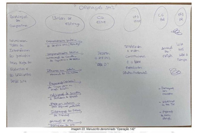 "Ainda na análise do material apreendido na sede do Partido Liberal, mais especificamente na mesa do assessor do general BRAGA NETTO, coronel PEREGRINO, em uma pasta denominada “memórias importantes”, foi encontrado um esboço de ações planejadas para a denominada “Operação 142”. Tal fato evidencia a preocupação dos investigados com a possibilidade da existência de uma minuta física relacionada ao art. 142 da CF encontrada pela Polícia Federal. O documento é manuscrito", destaca a PF em relatório enviado ao Supremo.