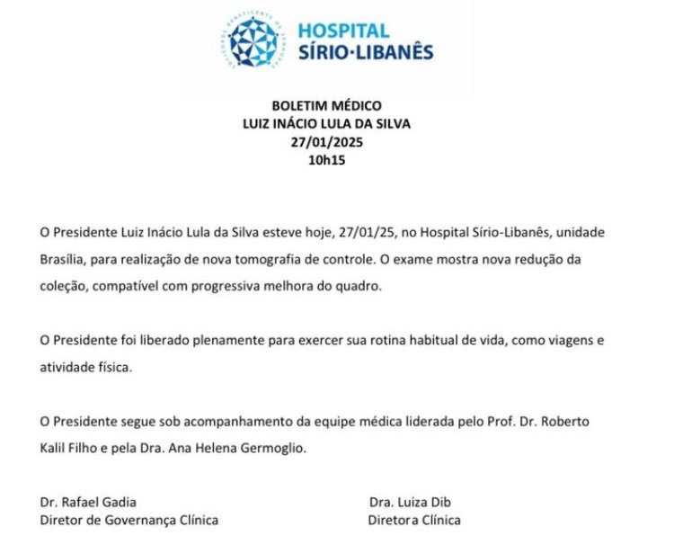Boletim médico divulgado na segunda, 27/1, sobre os cuidados recomendados ao presidente Luís Inácio Lula da Silva: Lula foi liberado pela equipe médica para retomar plenamente suas atividades presidenciais e pessoais.