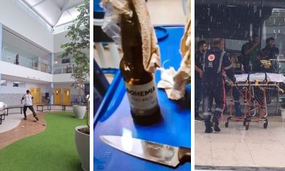 Durante a agressão, o menor de idade teria batido com a faca em uma das portas de vidro a escola até quebrá-la e, após quebrar, correu para atingir a professora.
