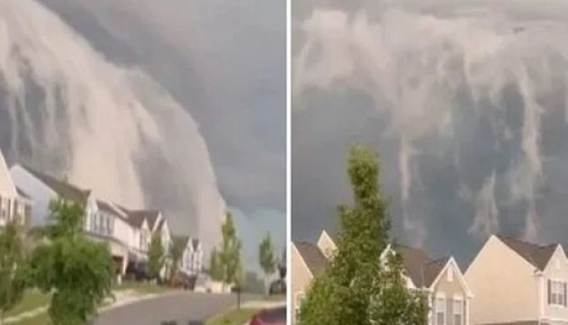 Imagens da formação incomum de nuvens — conhecida como arcus ou, mais apropriadamente, nuvem rolante — mostram uma enorme formação de nuvens rolando em direção a uma fileira de casas em uma rua vazia.