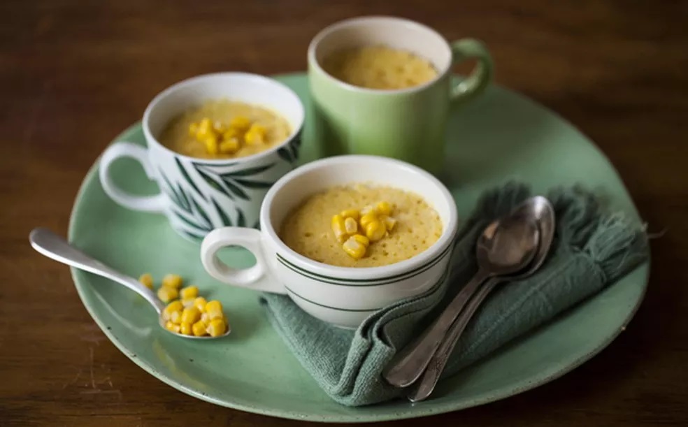 No liquidificador, bata o milho, o leite de coco, o ovo, o óleo, o açúcar, o fubá e o fermento até homogeneizar. Despeje em canecas que possam ir ao micro-ondas, deixando um espaço da borda. Leve ao micro-ondas por 3 minutos ou até assar e dourar. Retire, cubra com o leite condensado e sirva decorado com coco ralado.