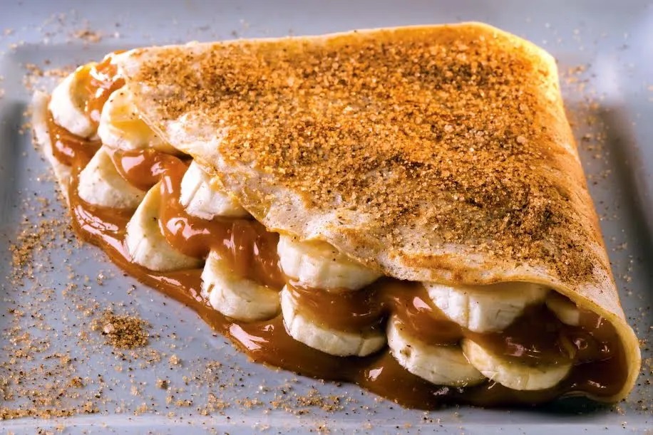 Bata no liquidificador o leite, os ovos, a farinha de trigo, a maisena, o fermento, o açúcar e o sal até ficar homogêneo. Aqueça uma frigideira antiaderente com a manteiga e frite a massa, de concha em concha, até dourar dos dois lados e terminar a massa. Reserve. Misture a banana e o doce de leite, divida entre as massas e dobre ao meio. Sirva em seguida.