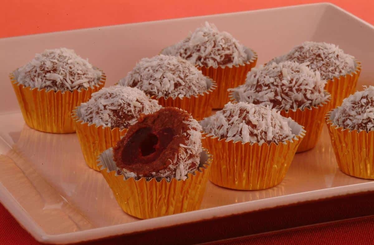 Abra uma pequena porção da massa na mão e recheie com a cereja reservada. Enrole formando bolinhas. Passe pelo coco ralado e coloque em forminhas. Sirva em temperatura ambiente ou gelado.