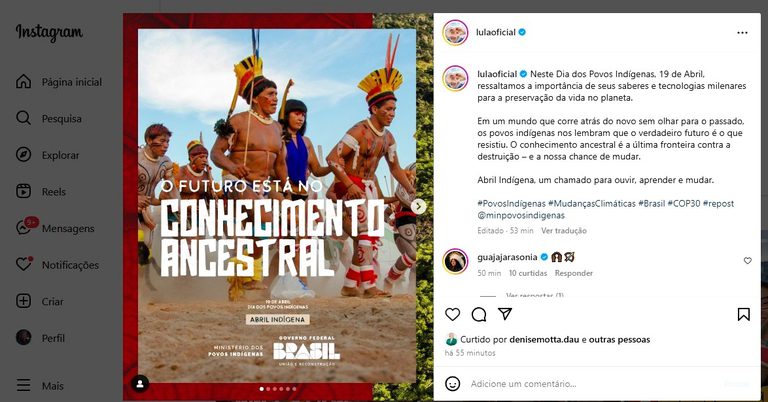 Neste sábado, 19 de abril, o Brasil celebra o Dia dos Povos Indígenas. O presidente Luiz Inácio Lula da Silva publicou em sua conta no Instagram uma mensagem, também divulgada pelo Ministério dos Povos Indígenas, em que valoriza o conhecimento ancestral e reafirma a crença que o futuro não pode prescindir do passado.