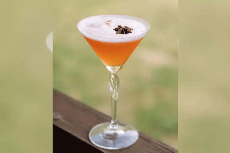 Passe a casca de laranja pela borda da taça para aromatizar. Misture os ingredientes delicadamente e finalize com o anis-estrelado.