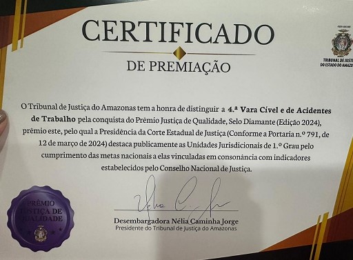 A 4ª Vara Cível e de Acidentes de Trabalho do Tribunal de Justiça do Amazonas (TJ/AM) alcançou um marco significativo em sua trajetória ao ser agraciada com o Selo Diamante do Prêmio Justiça de Qualidade, uma das maiores honrarias concedidas pela instituição. Este reconhecimento é um reflexo do trabalho incansável, da dedicação e do compromisso de toda a equipe, que tem buscado incessantemente oferecer excelência na prestação jurisdicional.