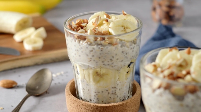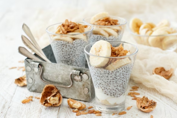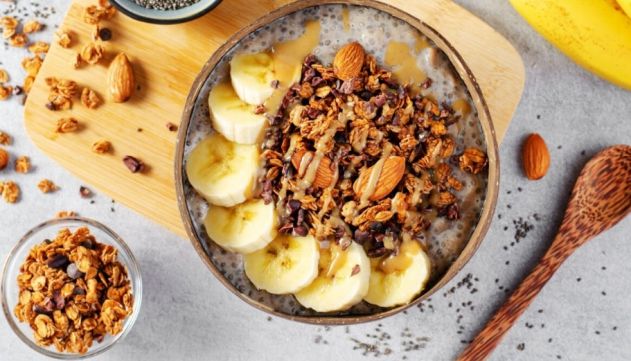 Pudim de chia com banana, granola e amêndoas