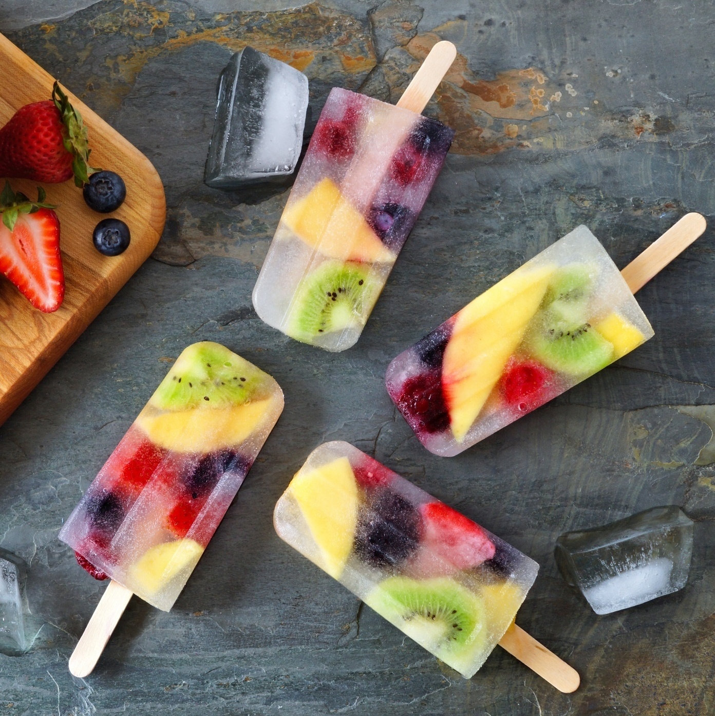 Coloque as frutas em forminhas de picolé. Em seguida, cubra com a água de coco e espete os palitos de madeira para picolé. Leve ao freezer por duas horas, desenforme e sirva em seguida.