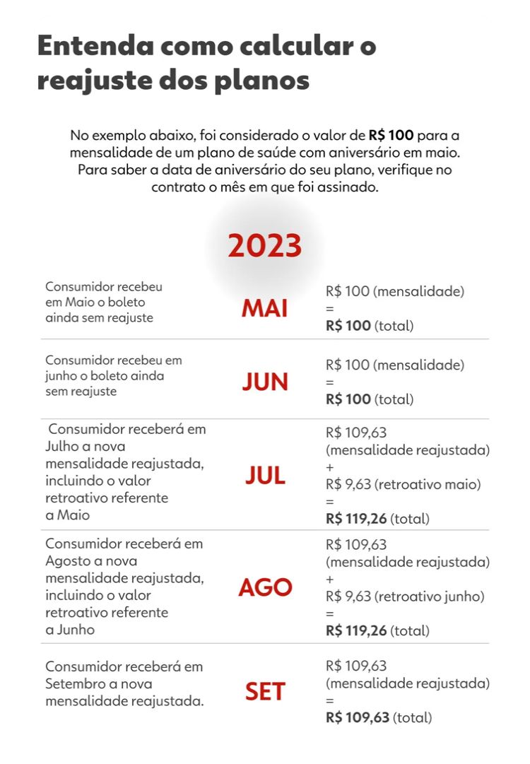 As diferenças no valor das mensalidades reajustadas de maio e junho serão cobradas, respectivamente, em julho e agosto - além do reajuste já previsto nesses meses (entenda o cálculo abaixo). O reajuste é válido para os planos médico-hospitalares contratados a partir de janeiro de 1999 ou que foram adaptados à nova legislação (Lei nº 9.656/98).