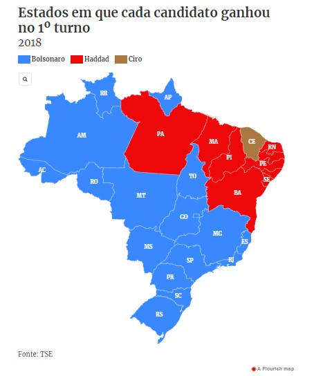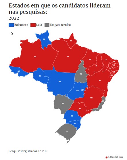 A exceção é o Rio Grande do Sul, onde há empate técnico. O panorama atual nesses lugares é semelhante ao de 2018, quando Fernando Haddad venceu no Nordeste, e o então deputado federal e agora presidente levou a melhor em Santa Catarina, Paraná e Rio Grande do Sul.