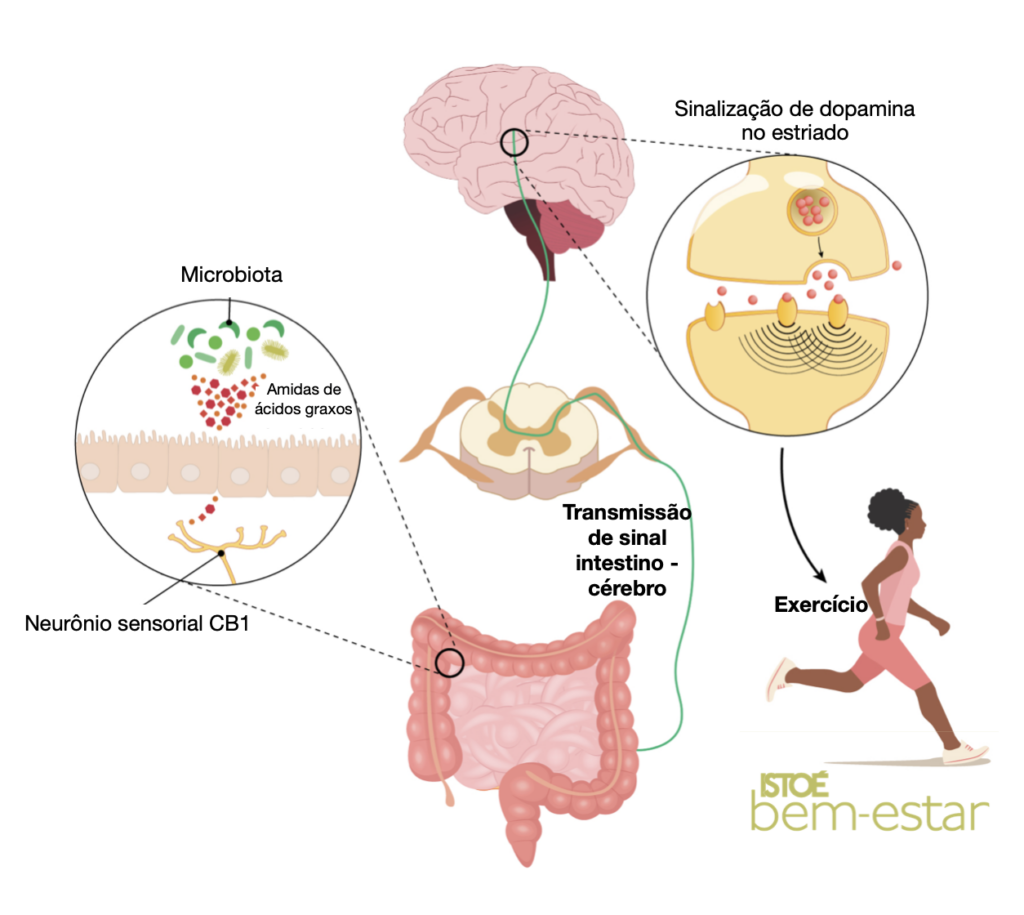 Por outro lado, a inibição dos neurônios sensoriais que inervam o intestino recapitulou o efeito da depleção do microbioma no exercício, enquanto a estimulação dos aferentes sensoriais restaurou a capacidade de exercício mesmo na ausência do microbioma.Foi identificada uma via pela qual a produção microbiana de amidas de ácidos graxos (FAAs) aumentava a atividade dos neurônios sensoriais através do receptor endocanabinóide CB1. Este aumento na atividade neuronal, por sua vez, impulsionou a sinalização de dopamina no estriado durante o exercício.
