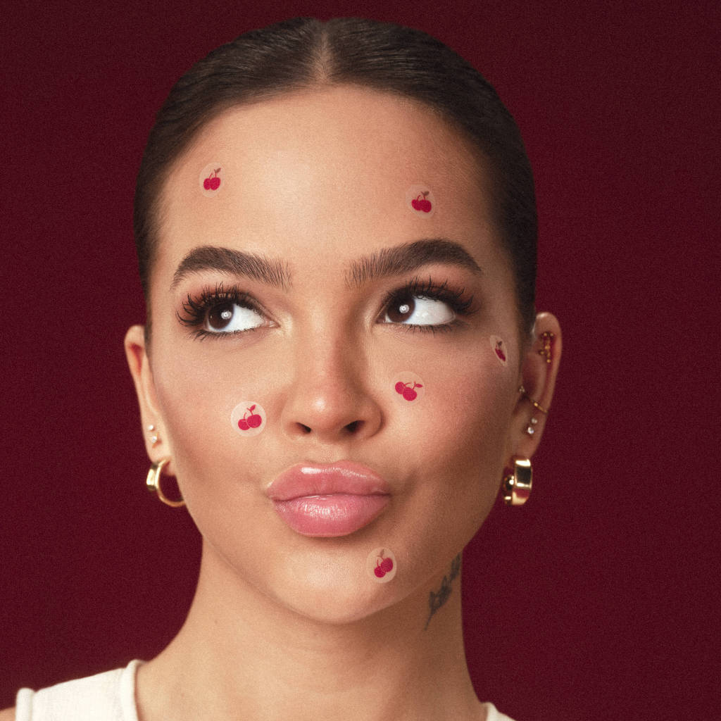 Mulher jovem com cabelo preso, usando regata branca, com pequenos adesivos vermelhos de maçã espalhados pelo rosto. Marcas têm apostado em criar as próprias versões, caso d'O Boticário, que lançou em fevereiro adesivos com desenho de cereja. Até mesmo o cantor Justin Bieber colocou à venda, nesta semana, sua linha de "acne patches" (o nome em inglês dos secativos), em parceria com a esposa, Hailey Bieber, dona da marca de beleza Rhode. O interesse de pesquisa por adesivos para espinha atingiu o pico neste mês, segundo dados do Google Trends.