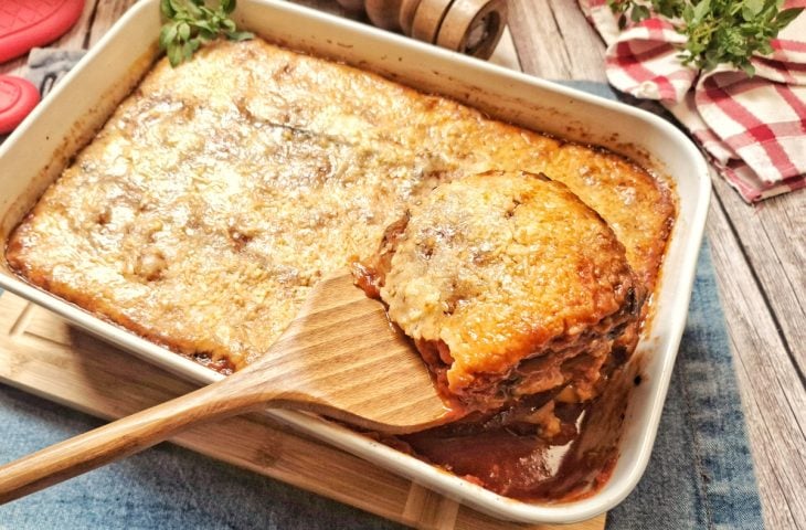 Retire, sirva e aproveite sua espetacular lasanha de arroz com berinjela!