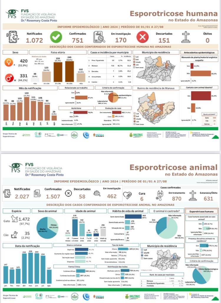 O informe é dividido em dados de esporotricose humana, notificados à SES-AM, por meio da FVS-RCP; e esporotricose animal de Manaus, notificados à Secretaria Municipal de Saúde (Semsa) da capital. O documento é atualizado mensalmente, na última terça-feira do mês.