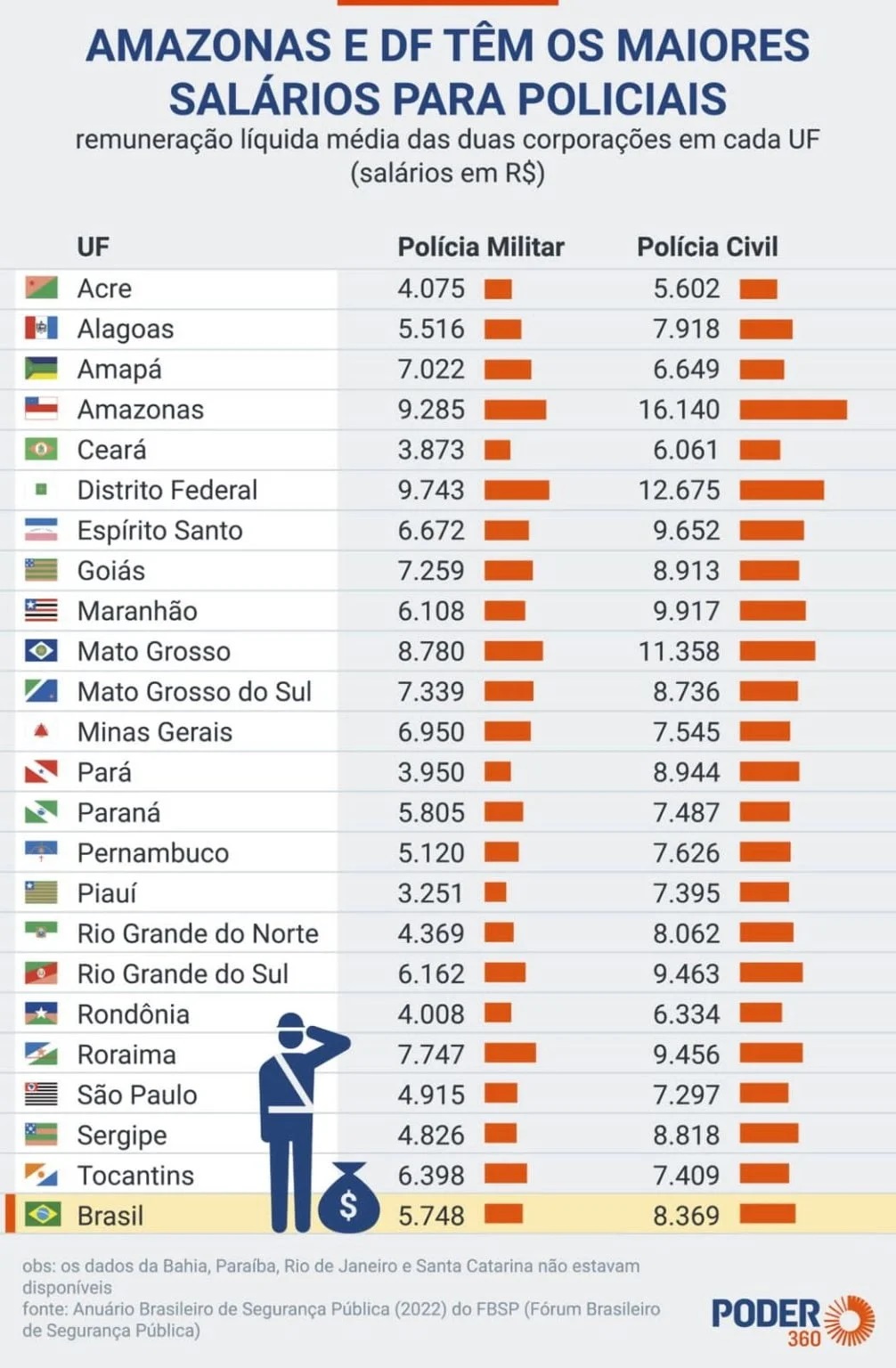 Policiais militares do Distrito Federal recebem, em média, R$ 9.742,00; já os funcionários da Polícia Civil do Amazonas ganham R$ 16.140,00