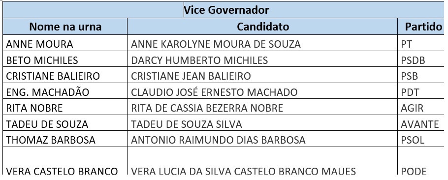 De acordo com o TSE, são oito candidatos ao governo do estado (com oito vices), sete ao Senado Federal (e mais 14 suplentes), 162 a deputado federal e 423 a deputado estadual.as 621 candidaturas registradas no Tribunal Regional Eleitoral do Do total de candidatos, 408 são homens e 213 são mulheres. Dentro os candidatos 196 se declararam brancos e 39 candidaturas foram autodeclaradas negras, enquanto que os indígenas registraram 18 representantes na disputa deste ano.