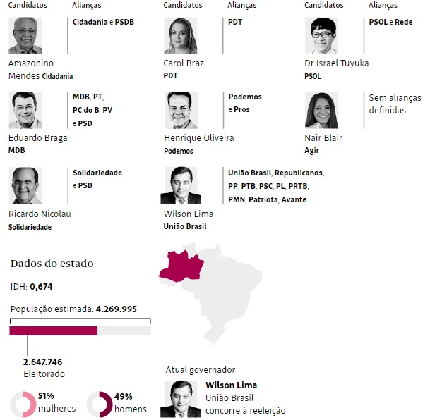 Com gestão marcada por dois colapsos do sistema de saúde na pandemia, crises ambientais, na segurança pública e suspeitas de corrupção, o governador do Amazonas, Wilson Lima (União Brasil), concorre à reeleição contra nomes da política tradicional do estado que ele derrotou, há quatro anos, com votação histórica.