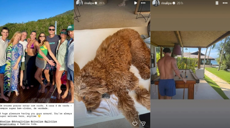Os apresentadores Angélica e Luciano Huck abriram a casa de praia em Angra dos Reis, no Rio de Janeiro, para receber Dua Lipa e seus familiares. O registro foi publicado por Huck no Instagram nO sábado, 22.
