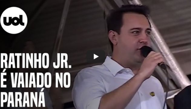O governador do Paraná, Ratinho Jr. (PSD), filho do empresário e apresentador Carlos Massa, o Ratinho, foi vaiado durante evento realizado na tarde de hoje em Maringá (PR), e o seu discurso durou apenas 25 segundos. Ele estava ao lado do presidente Jair Bolsonaro (sem partido) e do líder do governo na Câmara, Ricardo Barros (PP-PR).
