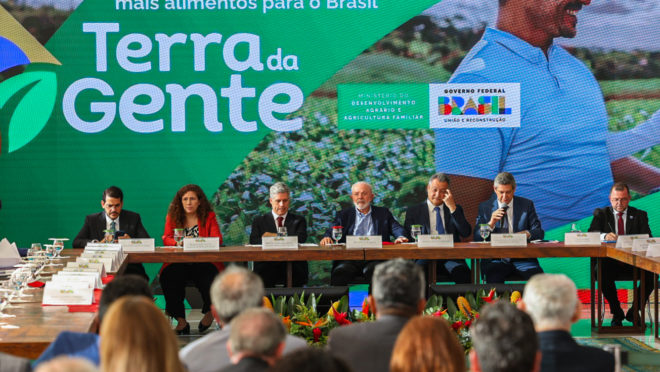 Nesta sexta-feira, 7/3, durante um evento em Campo do Meio (MG), o presidente Luiz Inácio Lula da Silva e o ministro do Desenvolvimento Agrário e Agricultura Familiar, Paulo Teixeira, anunciaram novas entregas e atos do programa Terra da Gente e outras medidas de apoio à reforma agrária. Duas das 11 terras do Terra da Gente destinadas à reforma foram entregues pelo presidente. A cerimônia, realizada sob uma tenda instalada em plena área rural, contou também com a presença da primeira-dama Janja Lula da Silva, de ministros – Paulo Teixeira (Desenvolvimento Agrário e Agricultura Familiar, Esther Dweck (Gestão e Inovação em Serviços Públicos), Alexandre Silveira (MInas e Energia), entre outros – além de outras autoridades federias e locais.