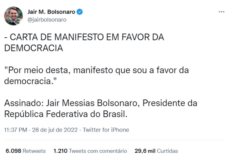"CARTA DE MANIFESTO EM FAVOR DA DEMOCRACIA. 'Por meio desta, manifesto que sou a favor da democracia'. Assinado: Jair Messias Bolsonaro, Presidente da República Federativa do Brasil", escreveu.