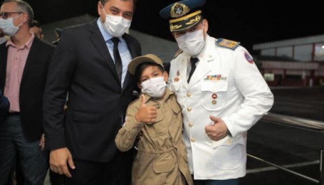 A noite na última sexta-feira (17/12) foi especial para o pequeno João Vitor Oliveira, de 11 anos. Ao lado do governador do Amazonas, Wilson Lima, ele acompanhou de perto a cerimônia de troca de comando do Corpo de Bombeiros Militares do Amazonas (CBMAM), e realizou o sonho de vestir a farda da tropa. No início deste mês, João conheceu o governador durante a entrega do cartão Auxílio Estadual no bairro Cidade Nova, na Zona Leste de Manaus, e externou o sonho de ser militar.