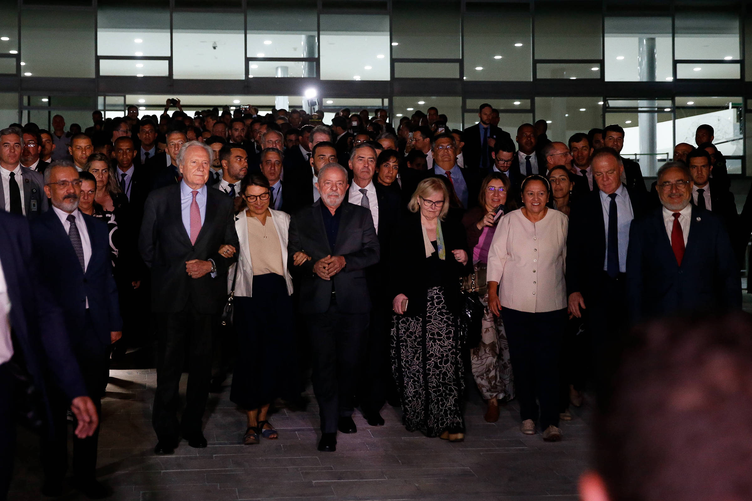 Ao fim da reunião entre Lula e os governadores, o grupo, que incluía o presidente dos demais poderes, desceu a rampa do Palácio do Planalto e foi a pé até o Supremo Tribunal Federal (STF). Tanto o prédio que abriga a Corte quanto a sede do governo federal estiveram entre os locais invadidos e depredados por bolsonaristas na tarde deste domingo, assim como o Congresso Nacional.