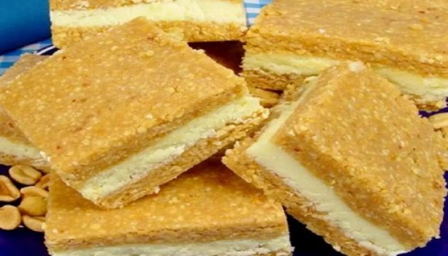 Espalhe na fôrma alisando com uma espátula. Cubra com o restante da paçoca, alisando. Leve à geladeira por 30 minutos, corte em quadrados e sirva.