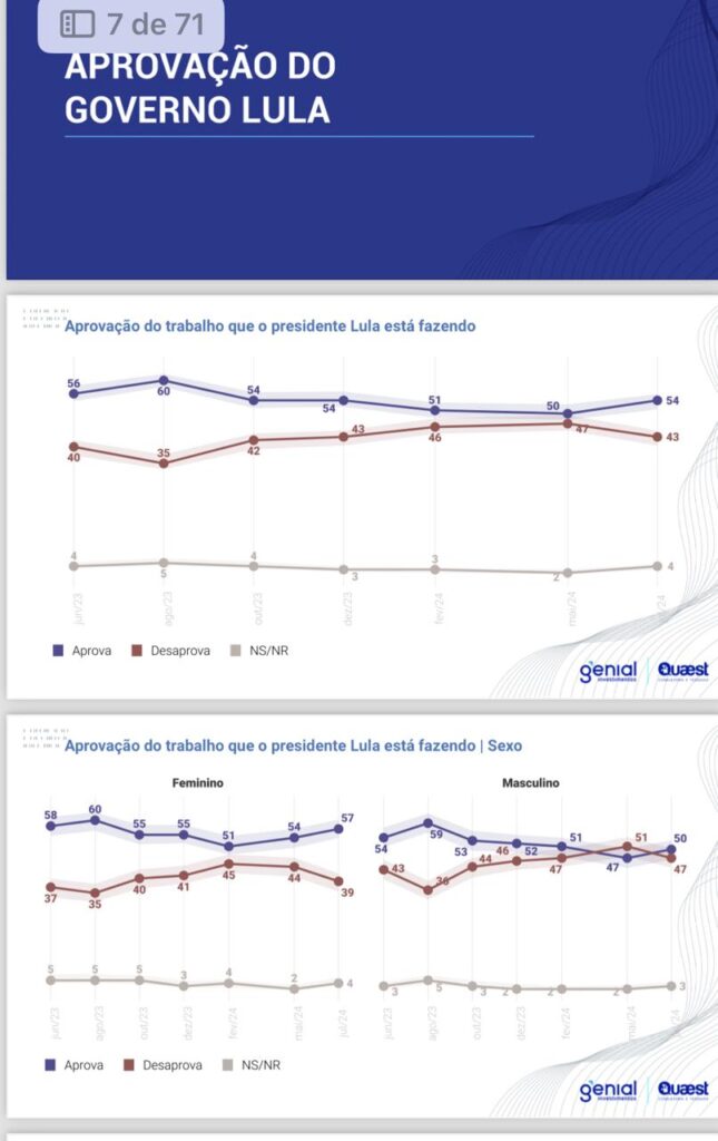 A melhora na aprovação do chefe do Executivo, de acordo com a pesquisa, ocorreu entre os eleitores que ganham até melhoria foi puxada pelos que ganham até dois salários mínimos, parcela do eleitorado em que a aprovação do petista subiu de 62% para 69%, entre maio e julho. Entre as mulheres, índice de aprovação de Lula avançou de 54% para 57% e a desaprovação recuou de 44% para 39%.