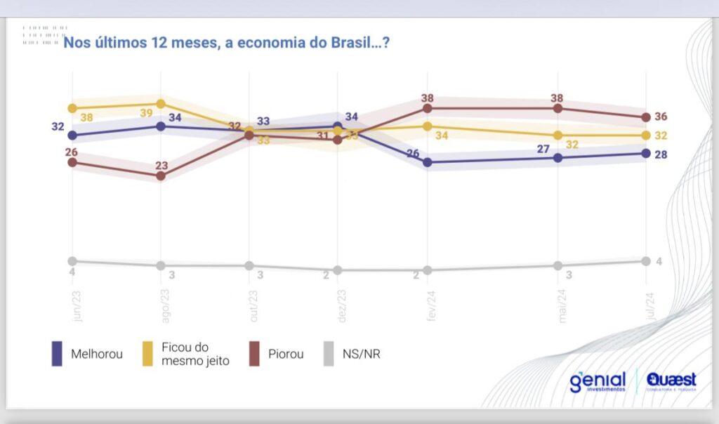 Apesar de a maioria dos eleitores não acharem que a economia piorou nos últimos 12 meses, a aprovação do presidente Luiz Inácio Lula da Silva (PT), voltou a subir e atingiu o maior nível do ano, conforme dados da terceira edição de 2024 da Pesquisa Genial/Quaest, divulgada nesta quarta-feira , 10/7.