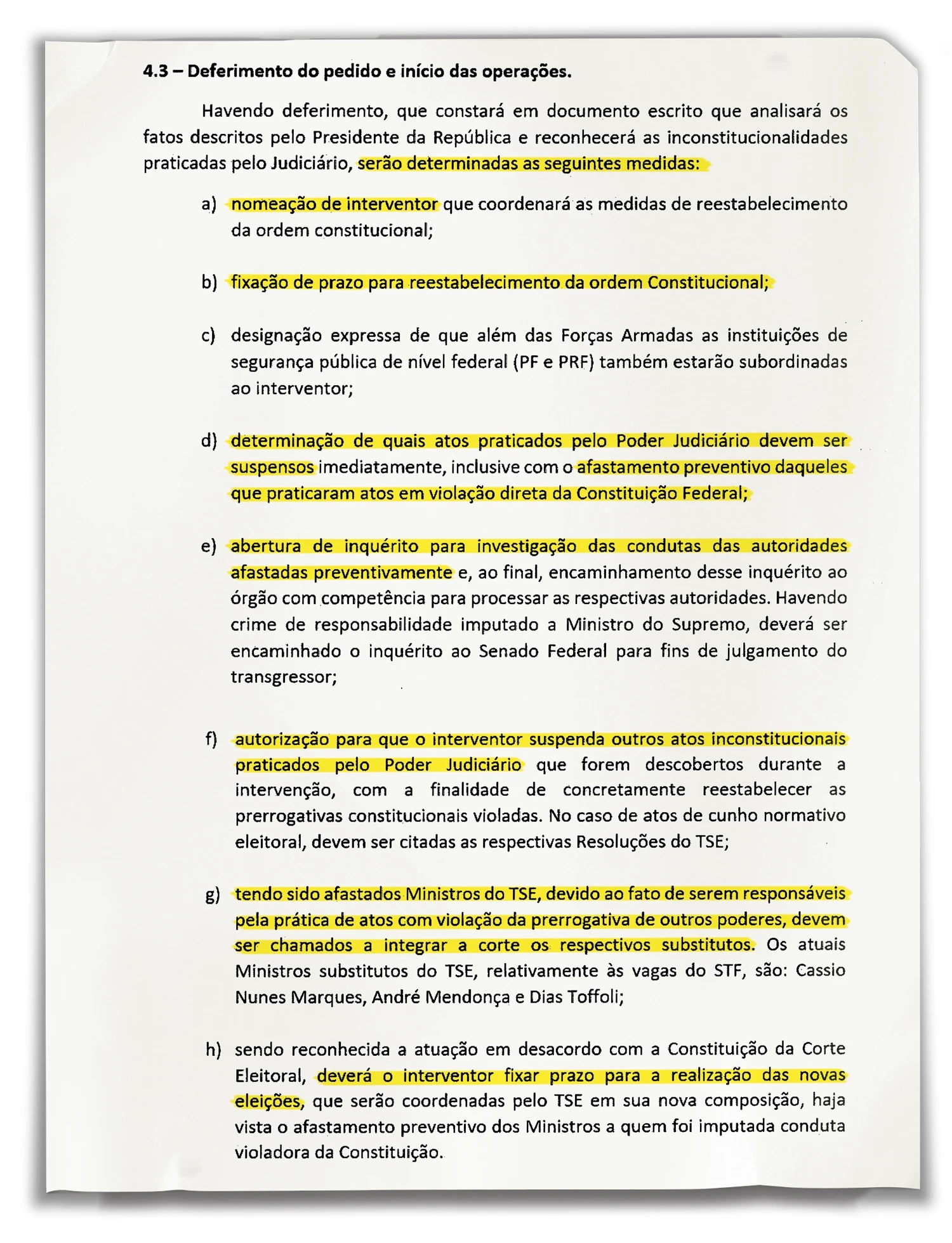 O documento, que não é aquela minuta encontrada com o ex-ministro Anderson Torres, ensina o passo a passo do golpe. O presidente da República encaminharia um relato das inconstitucionalidades praticadas pelo Judiciário aos comandantes das Forças Armadas, que avaliariam os argumentos. Se concordassem, nomeariam um interventor investido de poderes absolutos. De início, ele fixaria um prazo para o “restabelecimento da ordem constitucional”. Na sequência, suspenderia decisões que considerasse inconstitucionais — a diplomação de Lula, por exemplo —, afastaria preventivamente os ministros do STF — Alexandre de Moraes, Cármen Lúcia e Ricardo Lewandowski, que na época integravam o TSE —, convocaria os substitutos — Kassio Nunes Marques, André Mendonça e Dias Toffoli —, abriria inquéritos para investigar as condutas de cada um dos magistrados e marcaria uma data para a realização da nova eleição presidencial — o que poderia acontecer em um mês, um ano ou quando os militares concluíssem que a “ordem constitucional” estivesse recuperada.