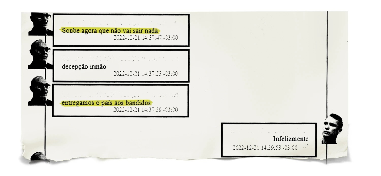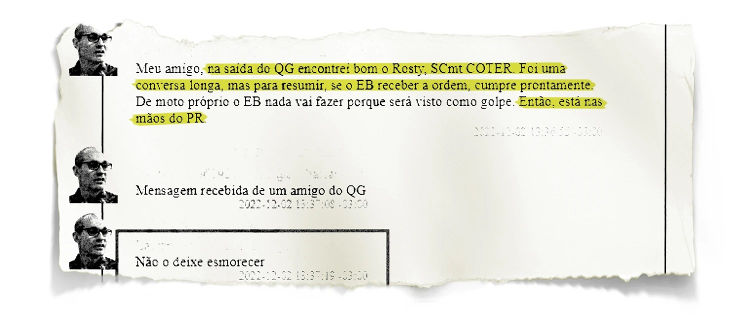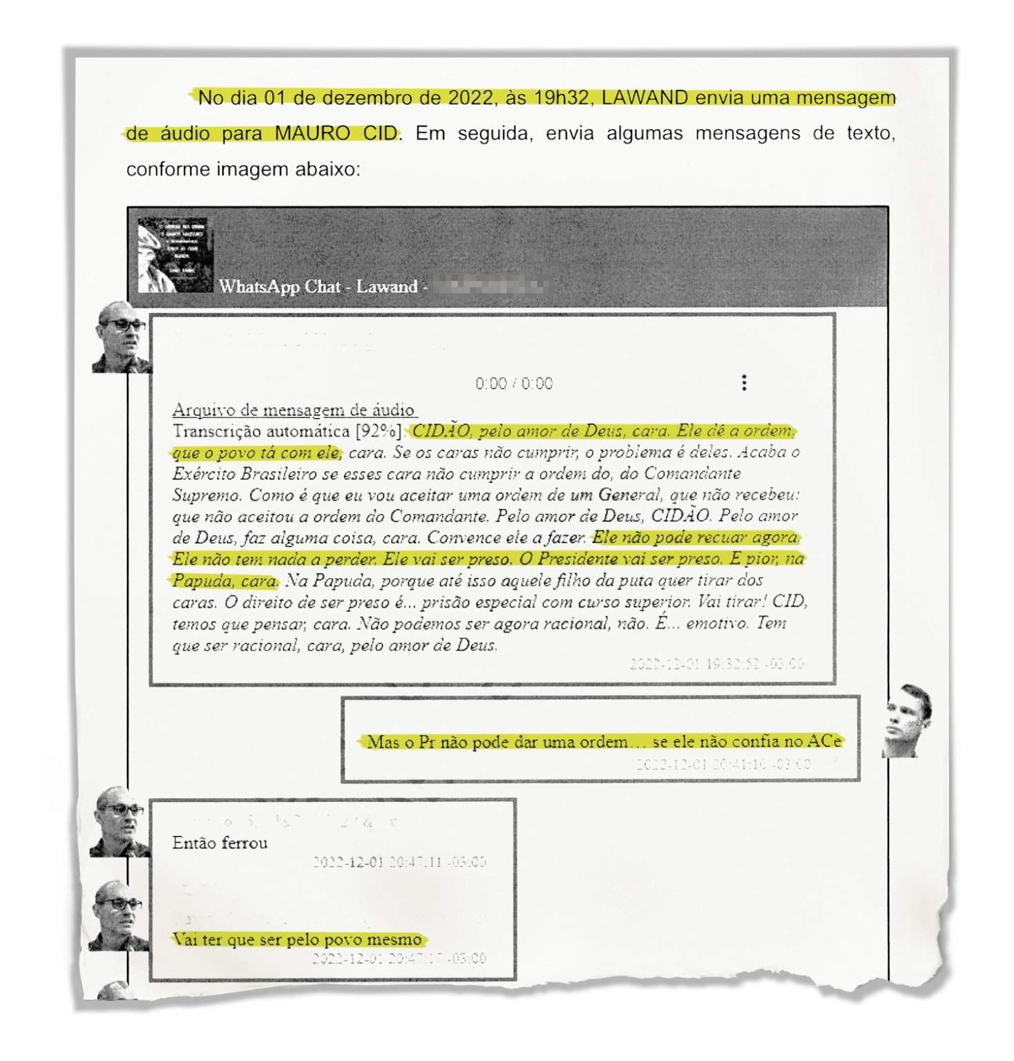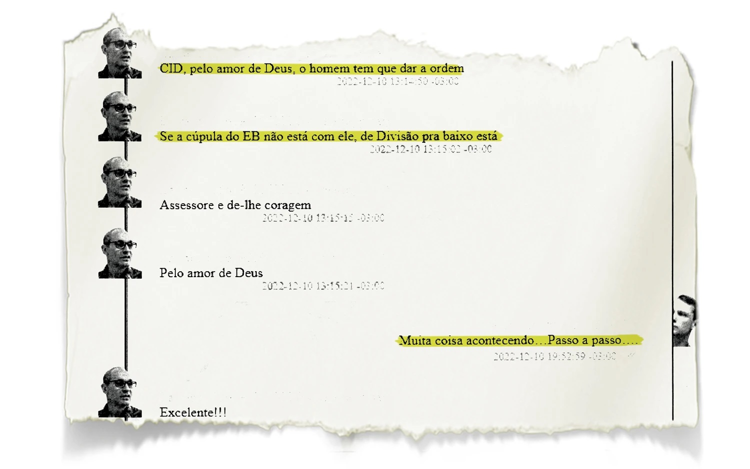 O coronel Jean Lawand Junior surge como um dos mais eloquentes apoiadores do golpe. Subchefe do Estado-Maior do Exército, ele trocou uma série de mensagens com Mauro Cid do início de novembro, logo depois das eleições, até o fim de dezembro, às vésperas de Bolsonaro deixar o país em direção aos Estados Unidos. Em uma delas, sugere, sem maiores mesuras, que Jair Bolsonaro precisava “dar a ordem” para que as Forças Armadas agissem. “Ele tem que dar a ordem, irmão. Não tem como não ser cumprida”, escreveu. Em outro diálogo, insiste: “Convença o 01 a salvar esse país!”. Cid responde com um enigmático “Estamos na luta!”. Em um áudio enviado ao então ajudante de ordens, o coronel insiste. “Pelo amor de Deus, Cidão. Pelo amor de Deus, faz alguma coisa, cara. Convence ele a fazer. Ele não pode recuar agora. Ele não tem nada a perder. Ele vai ser preso. O presidente vai ser preso. E, pior, na Papuda, cara”. Mauro Cid, de novo, não rechaça a sugestão golpista do colega e ainda diz que Bolsonaro não deu a ordem de intervenção militar porque “ele não confia no ACE”. ACE é uma referência ao Alto-Comando do Exército, a cúpula formada por generais e pelo ministro da Defesa.
