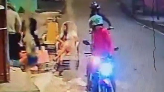 As imagens mostram um grupo de pessoas conversando na calçada quando quatro homens, divididos em duas motocicletas, se aproximam e param. Em seguida, os garupas descem rapidamente e anunciam o assalto.
