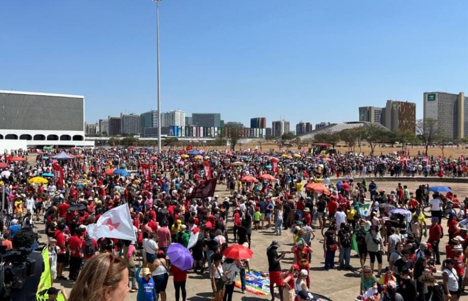 A concentração se iniciou por volta das 10h da manhã. Líderes de partidos e movimentos de esquerda discursaram em um trio elétrico debaixo de um dia de sol forte na capital federal. Havia diversas bandeiras de sindicatos e agremiações políticas, além de faixas em comemoração à condenação do ex-presidente Jair Bolsonaro pelo Supremo Tribunal Federal (STF).