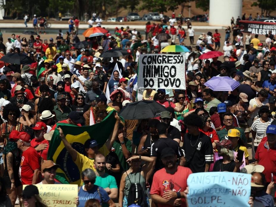 Milhares de manifestantes se reuniram neste domingo, 21/9, em frente ao Museu da República, na Esplanada dos Ministérios, em um protesto contra o projeto de lei que prevê anistia aos participantes das invasões às sedes dos Três Poderes, em Brasília, no dia 8 de janeiro de 2023. O ato também defendeu a derrubada da Proposta de Emenda à Constituição (PEC) da Blindagem, chamada pelos que estavam presentes no evento de “PEC da Bandidagem”.