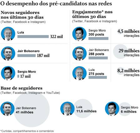 Conforme mostra levantamento da Bites a pedido do GLOBO, nos últimos 30 dias, o ex-ministro ganhou 17 mil novos seguidores nos seus perfis oficiais no Twitter, Instagram e Facebook. Já o petista, acumulou 322 mil novos usuários em suas contas, e Bolsonaro, 187 mil. A análise ressalta, ainda que as bases de Bolsonaro (41 milhões) e Lula (11,6 milhões) são mais expressivas que a de Moro (6 milhões) — este recorte leva em consideração também o YouTube.
