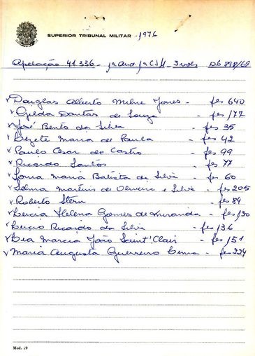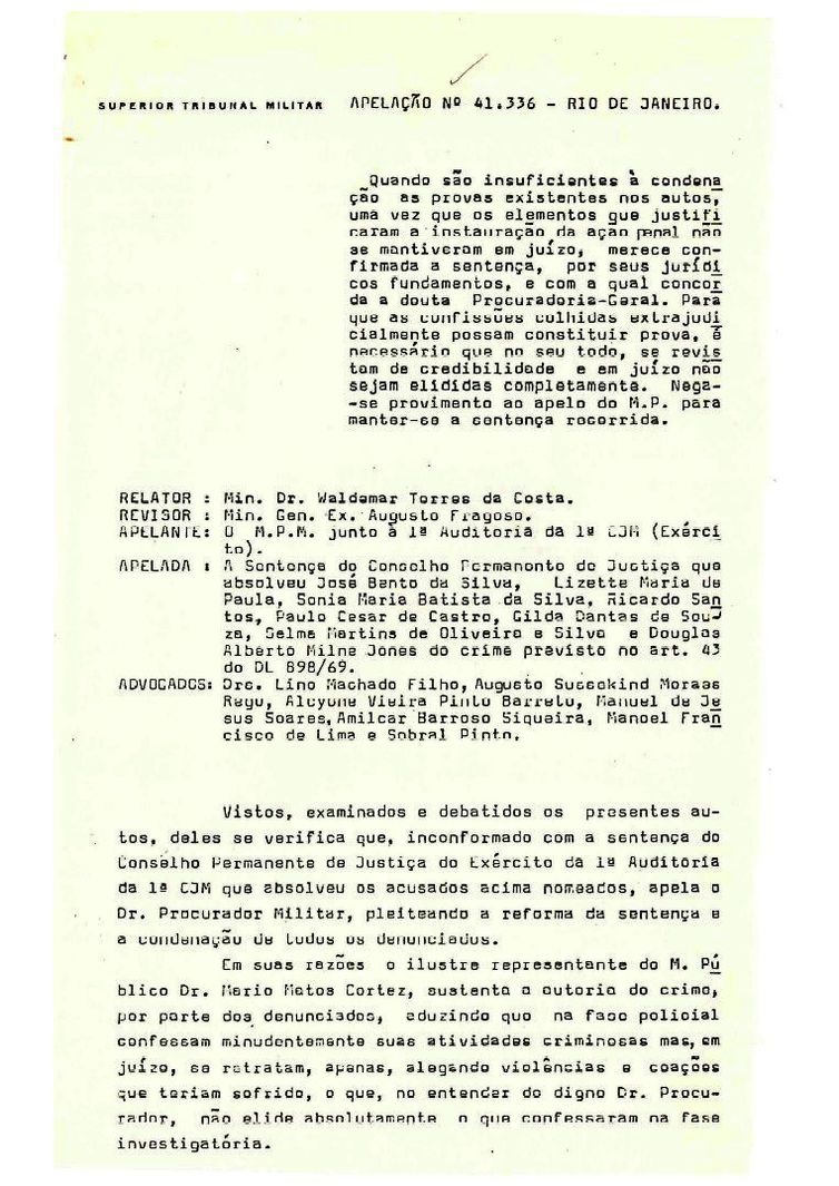 O caso em destaque é o julgamento da apelação 41.336 (RJ) no dia 2 de março de 1977. Oito estudantes foram acusados em 1974 de integrar o Partido Comunista Brasileiro, lançado à clandestinidade pela ditadura. Eles foram absolvidos em primeira instância em 1976, mas o Ministério Público Militar entrou com recurso contra a decisão. Desde o Ato Institucional Número 2, civis podiam ser processados por crimes políticos na justiça militar. Os réus foram novamente absolvidos em uma votação apertada de 5 a 4 no STM. Mas o que chama a atenção nas conversas entre os ministros é o debate sobre a existência de tortura em instituições militares.