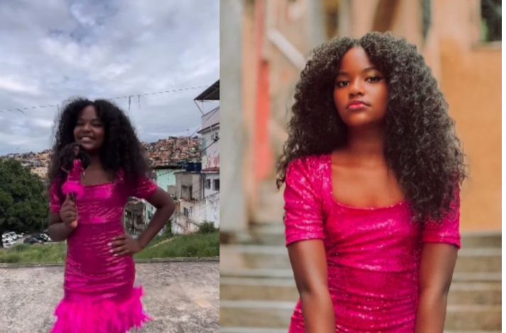 Anne Bellize, de 11 anos, ganhou de aniversário uma boneca negra e realizou uma sessão de fotos fantasiada como a personagem na comunidade Nova Brasília, no Complexo do Alemão.