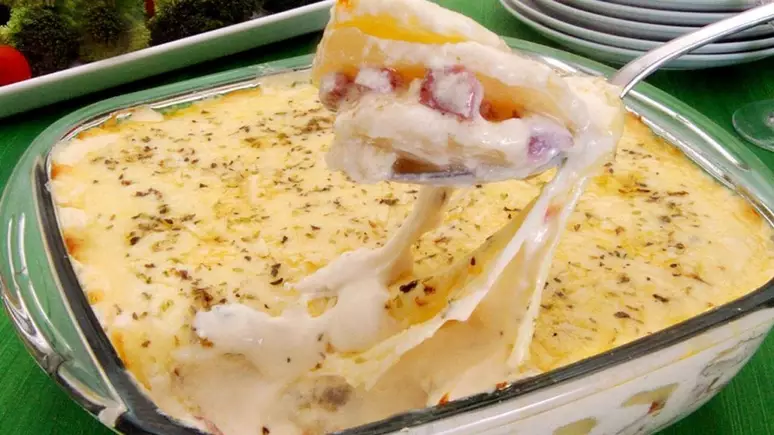 -Em um refratário médio untado, faça camadas de batata, molho e muçarela, terminando em muçarela.