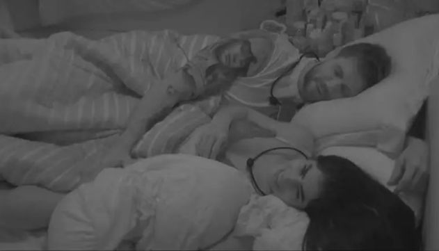 "Vocês vão dormir agarradinho, que gostoso", comentou Gabriela. "Cinco minutos, depois o Jonas vira para o lado", ironizou a Cunhã. "Saudade dormir agarradinho com a mulher", disse Alberto Cowboy, que também estava presente no cômodo para dormir.