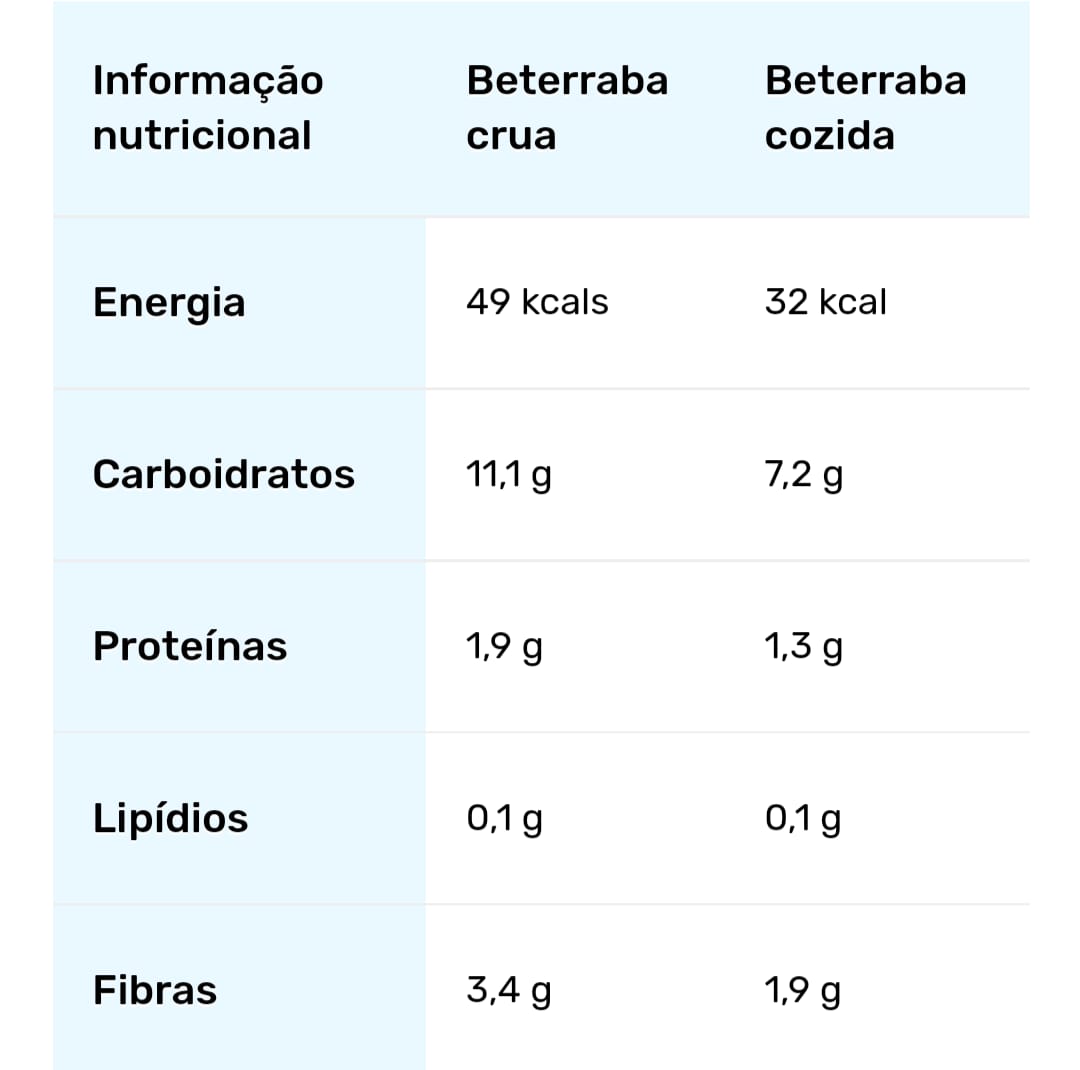 A tabela a seguir traz a composição nutricional em 100 g de beterraba crua e cozida.