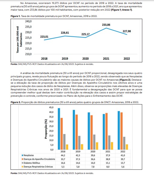 No Amazonas, foram registrados 19.273 óbitos por DCNT no período de 2018 a 2022. A taxa de mortalidade prematura (30 a 69 anos) pelos grupos dessas doenças apresentou aumento no período de 2018 a 2021, ano que apresentou maior taxa, com 233,86 óbitos por 100 mil habitantes, com posterior redução em 2022.